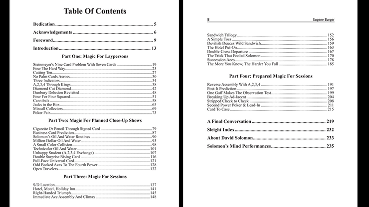 Jedná se o první knihu Davida Solomona. Obsahuje více než čtyřicet jeho originálních karetních sestav a desítky technik používaných v rámci těchto sestav. Je plná neotřelých postupů a nápadů, které budete moci uplatnit i u dalších karetních efektů ve svém repertoáru.