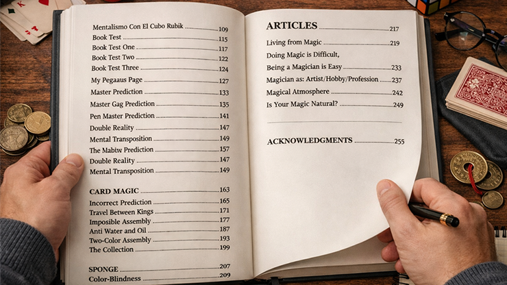 Knihu, která vás naučí magii a vyzve vás, abyste ji vášnivě prožívali. Na 255 stranách dosud nepublikovaných sestav a nápadů postavených na důmyslných strukturách otevírá Smayfer svůj tvůrčí vesmír a dělí se o úžasné efekty s mincemi, kartami, houbami, mentalismem a zasvěcenými články, které odrážejí jeho jedinečný způsob myšlení a tvorby.