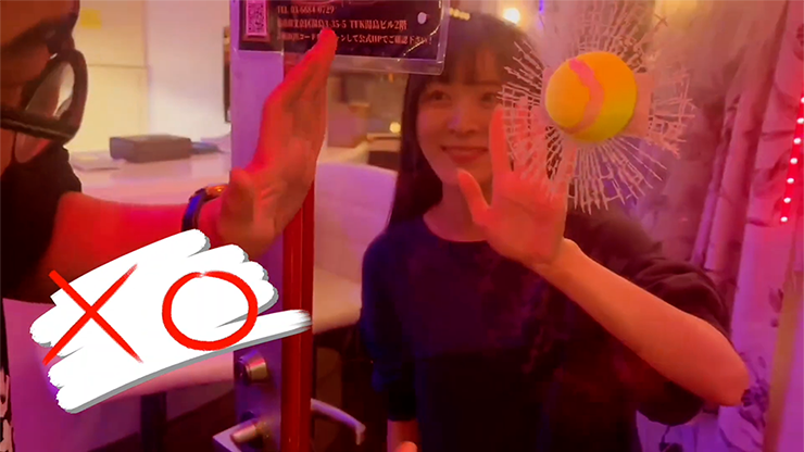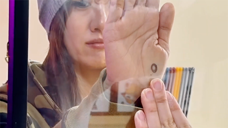• V okamžiku značka viditelně pronikne sklem... a objeví se na divákově ruce.
