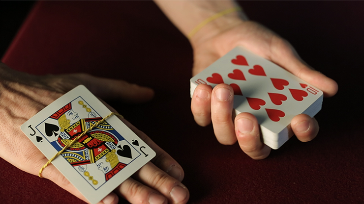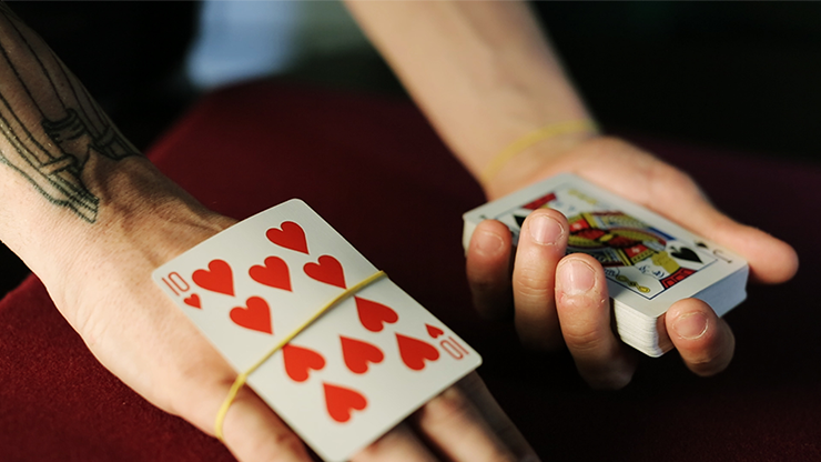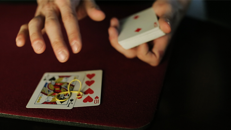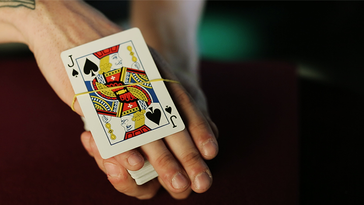 Watch as Dan selects two cards, then securely ties them down with a rubber band, only to see one selected card escape outside its confinement, to the top of his hand. In a shocking moment, you see one selected card instantly and visually trade places with the card on his hand, only to find that they have switched places, all while tied down, just like the timeless illusion, Metamorphosis that Houdini & Bess were famous for.