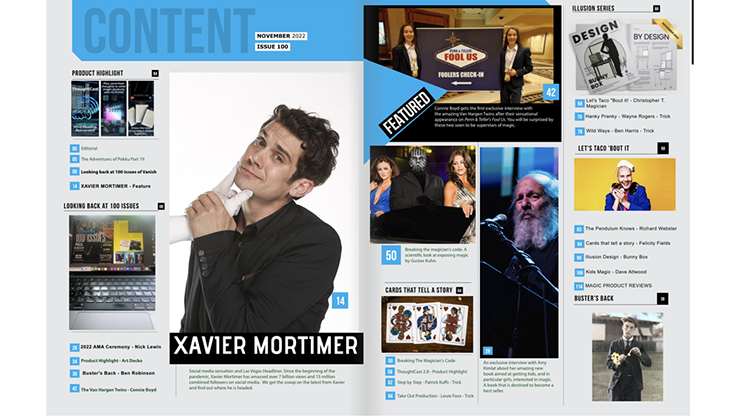 A special celebration of 100 issues of VANISH MAGIC MAGAZINE. The feature story is Xavier Mortimer who talks about his days performing on the streets of Paris to having his own show in Las Vegas. He also talks about his experiences with social media magic and how he has become one of the most viewed magicians in the world.