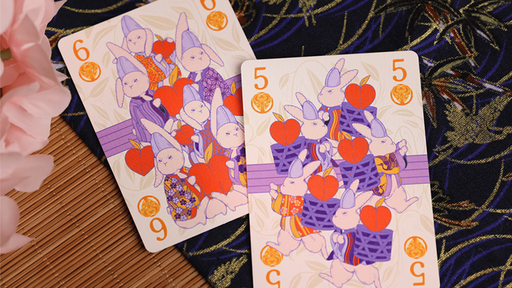 These Number Cards capture the joyous assembly of hares as they herald the coming of the gods. Each card features a unique hare, celebrated in a moment of reverent anticipation. The number cards feature a transformation deck, where the pips elegantly evolve into rabbits.